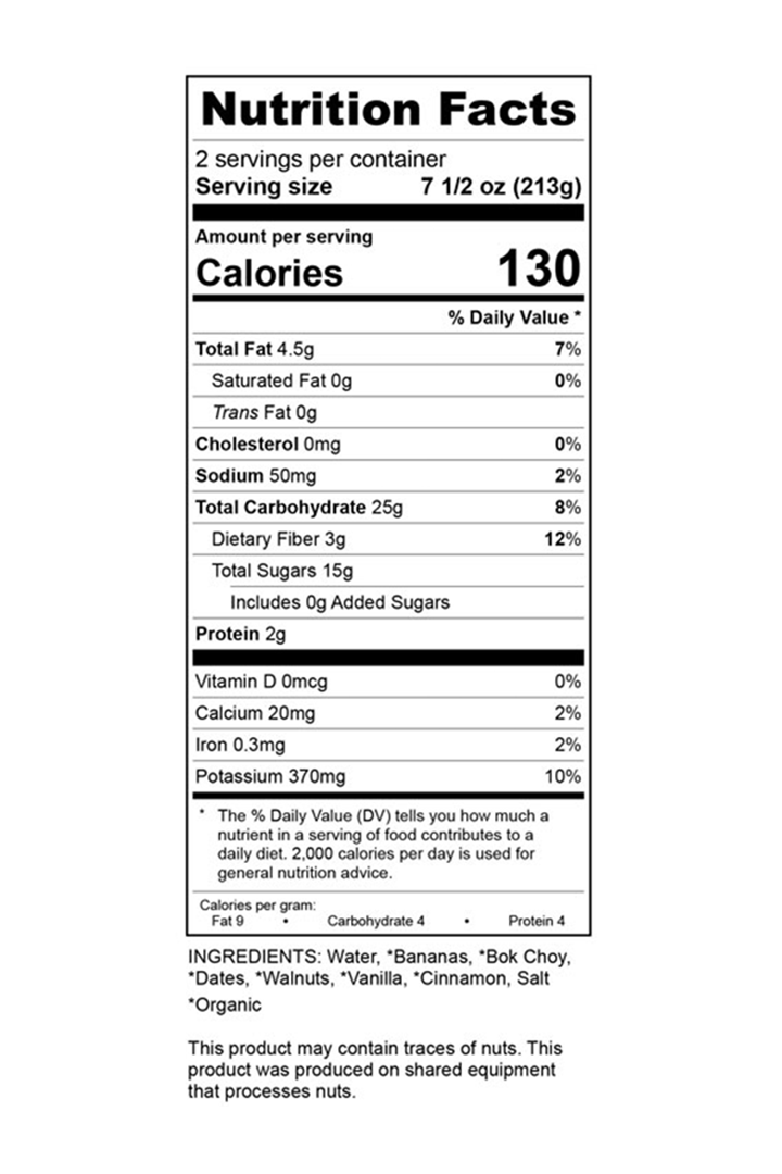 Water · Sea salt · Banana · Bok choy · Date · Walnut · Cinnamon · Vanilla