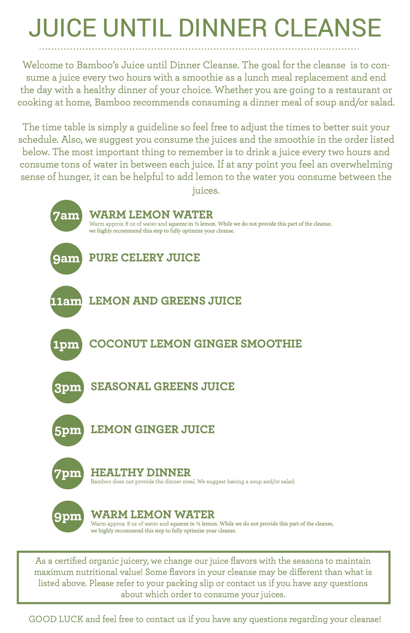Bamboo’s Juice Until Dinner Cleanse is perfect for those looking to reboot their system while still maintaining dinner commitments or other obligations where extra calories are needed. The goal for the cleanse is to consume a juice every two hours with a smoothie as a lunch meal replacement and to end the day with a healthy dinner of your choice. Whether you are going to a restaurant or cooking at home, Bamboo recommends consuming a dinner meal of soup and/or salad.
