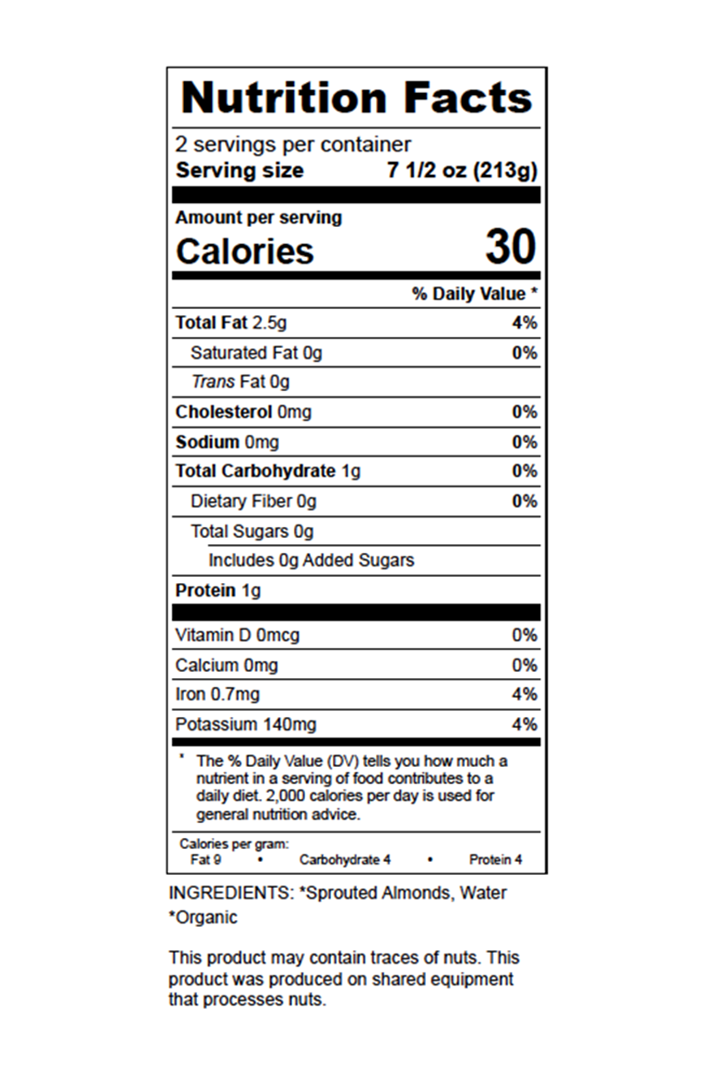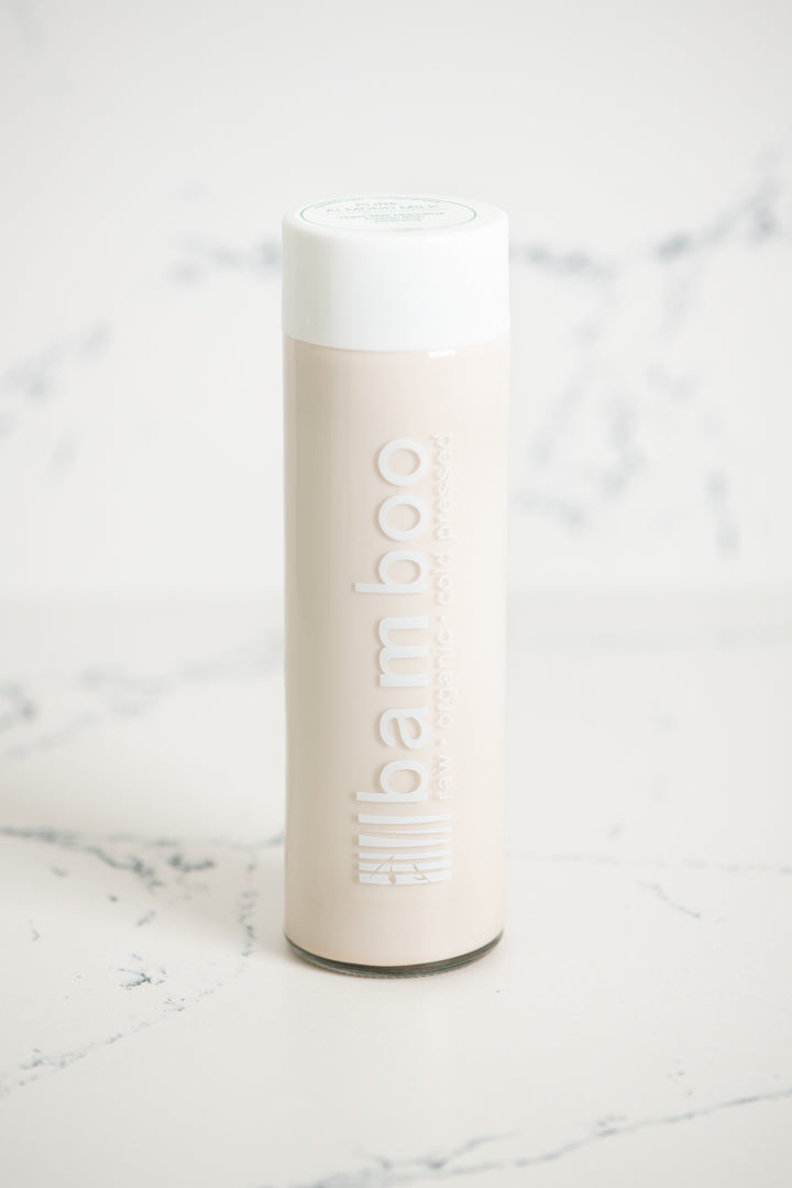 We soak our raw almonds overnight to remove enzyme inhibitors, which allows optimal digestion. After soaking, we blend the almonds with spring water to generate a paste. Finally, we cold press it to create our pure almond milk. The only two ingredients in this one is raw, unpasteurized almonds and spring water. Not only is almond milk delicious, it goes great in tea, coffee, smoothies and even cereal!