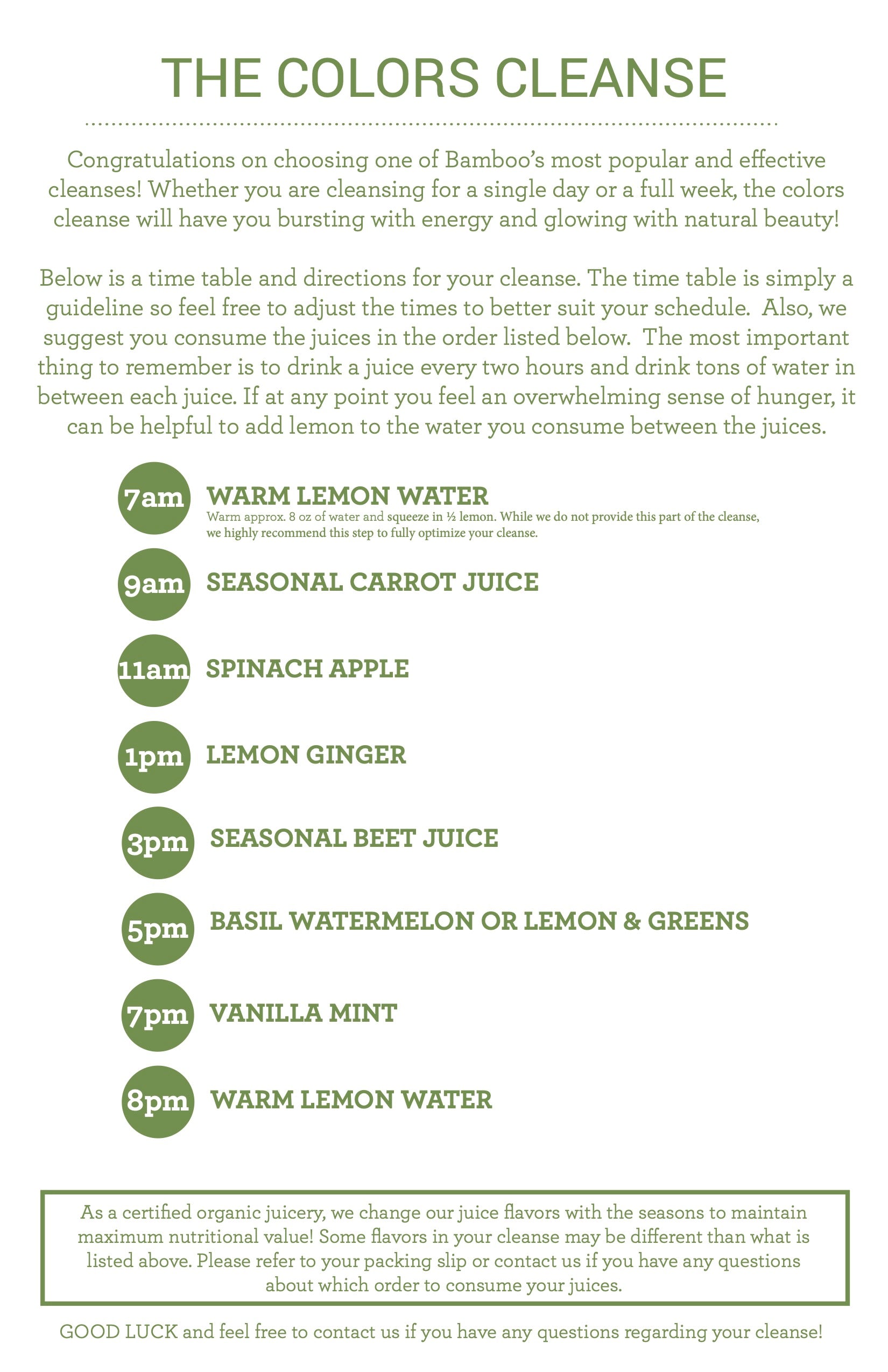 The Colors Cleanse is for customers looking to add variety into their cleanse. These juices and blends are carefully selected so that your entire body is glowing. The variety allows for an easier cleanse and is recommended for beginners.